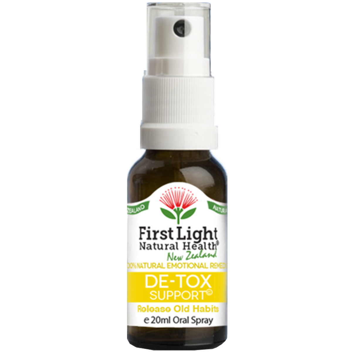 Contains: alkaline mineral water, ethanol (alcohol as a natural preservative), aqueous botanical infusions of Small White Rata (Metrosideros perforata), Manuka (Leptospermum scoparium), Whau (Entelea arborescens), Clematis (Clematis paniculata) and Akeake (Dodonaea viscosa). First Light Natural Health® De-tox Support© is made with First Light Flower Essences of New Zealand®: